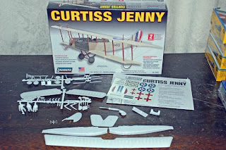 The Curtiss Jenny is a Lindberg kit. It cost $10.20 and it's definitely the most complicated of all the kits. This kit will be part of the Sky Pirates squadron and it will be used as a trainer and observation plane. I'm not looking forward to doing all the rigging but I don't think the plane will look quite the same without it. This plane in particular will be used mostly as a scenic piece so hopefully it won't get handled quite as roughly as the other planes.