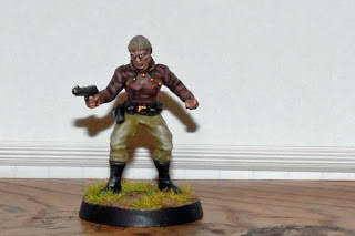 Here you can see the converted fig between two 28mm figures. The one on the left is from Copplestone Casting and the one on the right is from Pulp Figures. I think he makes a pretty good match height and size wise.