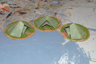 A few months ago we cut out and based about 20 of these little paper tents we found a pattern for on the Games Workshop web site. These were suppose to be used in one game but that game fell through so we ended up with the 20 tents just kinds sitting arround. Eventually we got around to painting three of them up as just white canvas tents for a D&D game but the rest just gathered dust. I decided tonight to paint up another three in a drab military style. I also finished up a tan one with a desert base but didn't photograph it yet. We also did some work on some scratchbuilt Orc Tents we did the assembly on last year but I forgot to get a picture of those. If you look through my game reports you should see the white tents in a few places.
