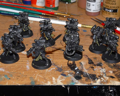 Squad Beta is comming along. I've only got a few hours in them so far. When painting squads I try to start with the big areas then work to the smaller areas that way the steps get shorter and shorter.