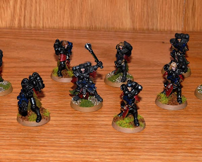 Squad Alpha is tabletop ready. I think I did an ok job matching the armor though it's not perfect. The new models are what most of my army will look like anyway. They are the ones with the static grass. Eventually I'll re-work the bases on the older models and give them a bit more highlighting but for now that's going to have to wait.