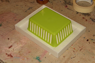 I picked up a few more supplies at Dollar Tree. Six plastic crates, some floral wire, and two packages of plastic hair curlers for bits. This cost another $5.41 so I am now up to a grand total of $53.49 on the project so far. I still want to pick up a package or two of ping pong balls but after this I think the rest of my budget will be paint. I glued some rectangles of poster board inside the green crates. This will be a penthouse or equipment storage area on the roof of the apartment.