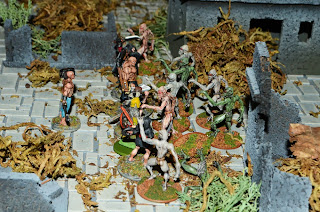 The party pressed on and reached the edge of the ruins just before dark.  The ground was paved with large flagstones littered with dead fall.  Many of the dark stone buildings were crumbling and most were being overtaken slowly by jungle growth.  The party had only just entered the ruins when they saw a large group of ghouls charging them.
