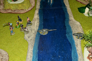 When they reached the ford they noticed the tracks of several creatures along the bank.  Again they saw crocodiles on the opposite shore but they were prepared for the ones lurking below the surface.  These beast were much more aggressive however and the three on the opposite bank immediately jumped into the water and began swimming towards them.  Proving his Hyrkanian skill Mon Tau killed one of the beast before it made it across.  Four of the creatures remained and they attacked the party.  Although the powerful creatures attacked relentlessly they were all dispatched in short order with no further injury.