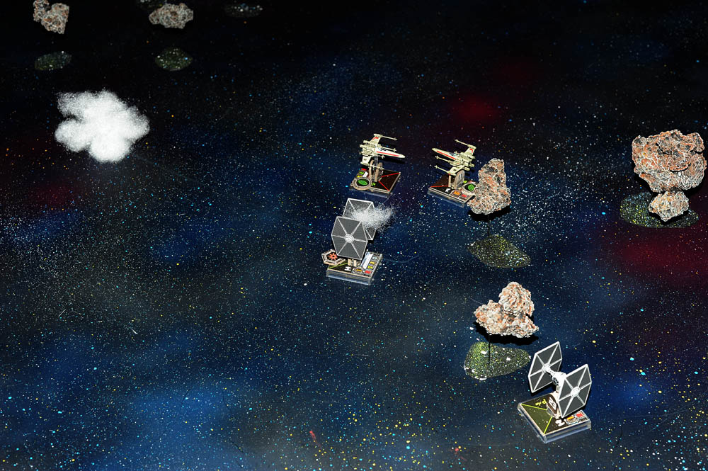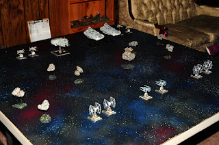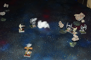 A Bothan voice comes over the comm "Mynock squadron this is Void Station.  Be careful on your approach.  We've had Hutt Raiders in system".  "Roger that Void Station" replies Jen Kule.  Almost on cue three fighters emerge from a cluster of small asteroids.  "Incoming! Two Y-wings and one Kihraxz." Tash exclaims.  "Buckle up Hemmy!" Dack shouts to his Astromech.