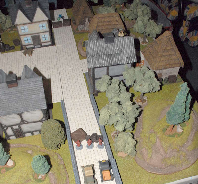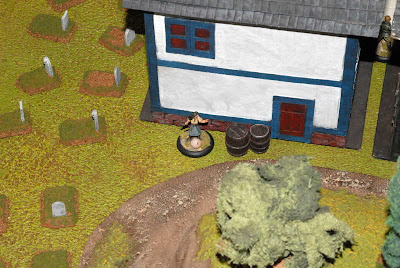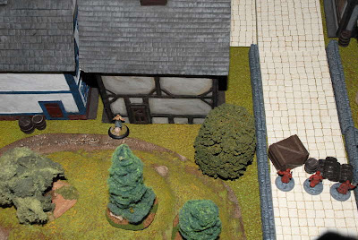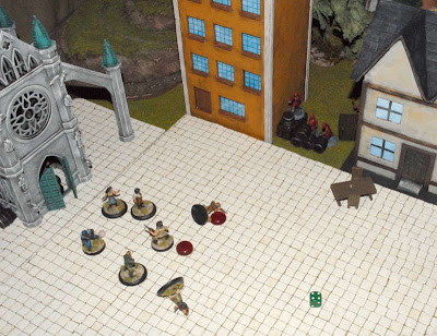 Most of the townsfolk guarding the barricades had come over to the church while the agents were investigating. Now almost everyone was exposed in the center of the town square. Agents De Fonce and Zeenich took cover just inside the church.