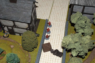 Distracted by the action in the town square the magic wielding cultist doesn't even realize agent De Fonce is behind him in the bushes. Selena carefully takes aim and shoots the wizard squarely between his shoulder blades. The magic wielding cultist goes down in a heap atop the crate he had been standing on.