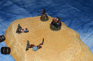 The next moment the battle was joined! The slavers rushed up the slope of the small hill. The AEsir hurled a hatchet at one of them but the poorly balanced tool flew wide of target and landed harmlessly in the sand below. The slavers attempted to push their way to the top of the hill but the slaves were not having it. The northman made a wide sweep with his ax that clearly missed the first slaver to make it to the top of the hill. Thinking he had a clear shot the slaver pulled his scimitar back high over his left shoulder for a back handed slash grinning wildly. The miss had been a feint however and before the slaver could deliver his blow the AEsir pulled back reversing his swing and smashing the back of his ax into the mans head. With a sickening wet thud the right side of the man's skull caved in and he rolled backwards down the hill to his death.